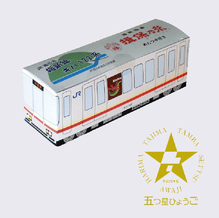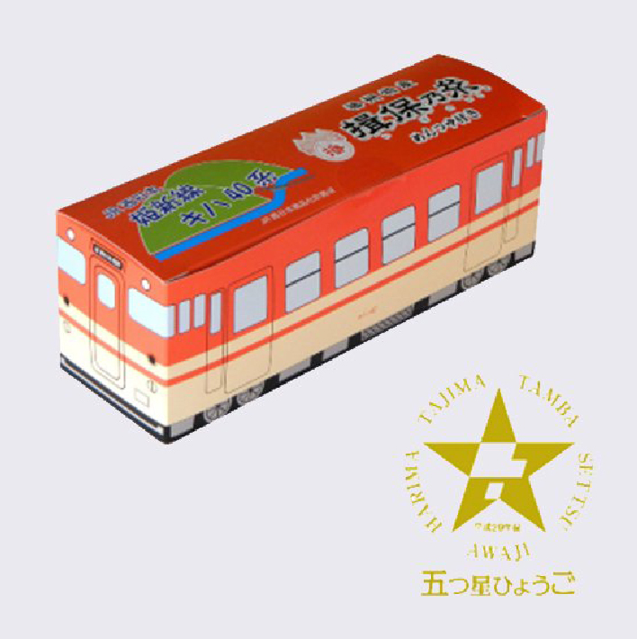 姫路駅から岡山県新見駅に至る鉄道ローカル路線を「JR姫新線(きしんせん)」を走る車両をモチーフにした森口のオリジナルパッケージです。観光のお土産品としてや、小さいお子様がいるご家庭、鉄道好きのお友達へのお中元・お歳暮等のギフトなどで、よくご購入されています。